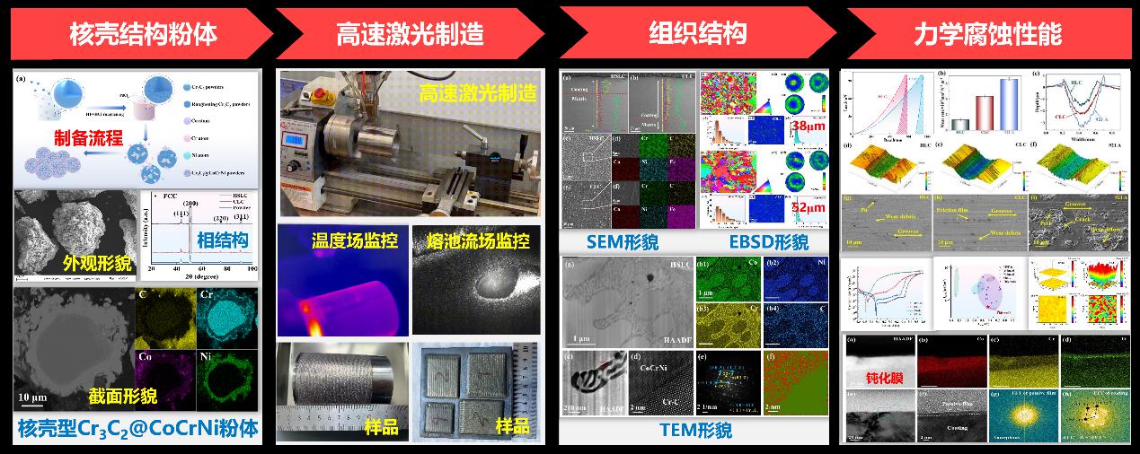 研发了具有核壳结构的粉体材料,利用高速激光熔覆技术制备了无裂纹Cr3C2@CoCrNi中熵合金涂层,硬度达7.8 GPa;与921钢相比,涂层耐磨性能提升了5倍,腐蚀电流密度下降2个数量级。