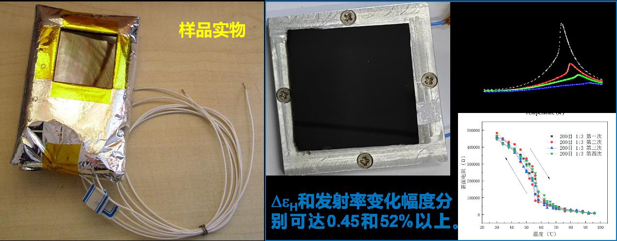 所研制热致变色可变发射率热控薄膜/涂层材料,发射率随温度变化自行调控,无需外界控制部件或者能量供给。根据被控目标需要,涂层/薄膜的发射率可以随温度升高而增大,或者随温度升高而减小,自行对被控目标实施热管理或红外辐射特征管控。研究成果应用于航天热控、智能窗以及隐身领域。