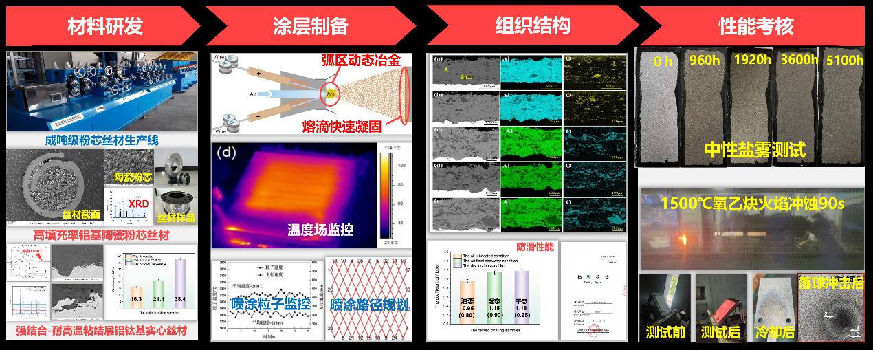 研发了高耐蚀-强结合-耐高温-耐磨防滑的铝基陶瓷复合涂层,涂层经5100 h中性盐雾后无鼓包、锈蚀等失效现象;涂层具有优异防滑性能和耐高温性能;1500 ℃高温焰流冲刷后:涂层表面无熔化、落球冲击后无裂纹,盐雾后无锈蚀。