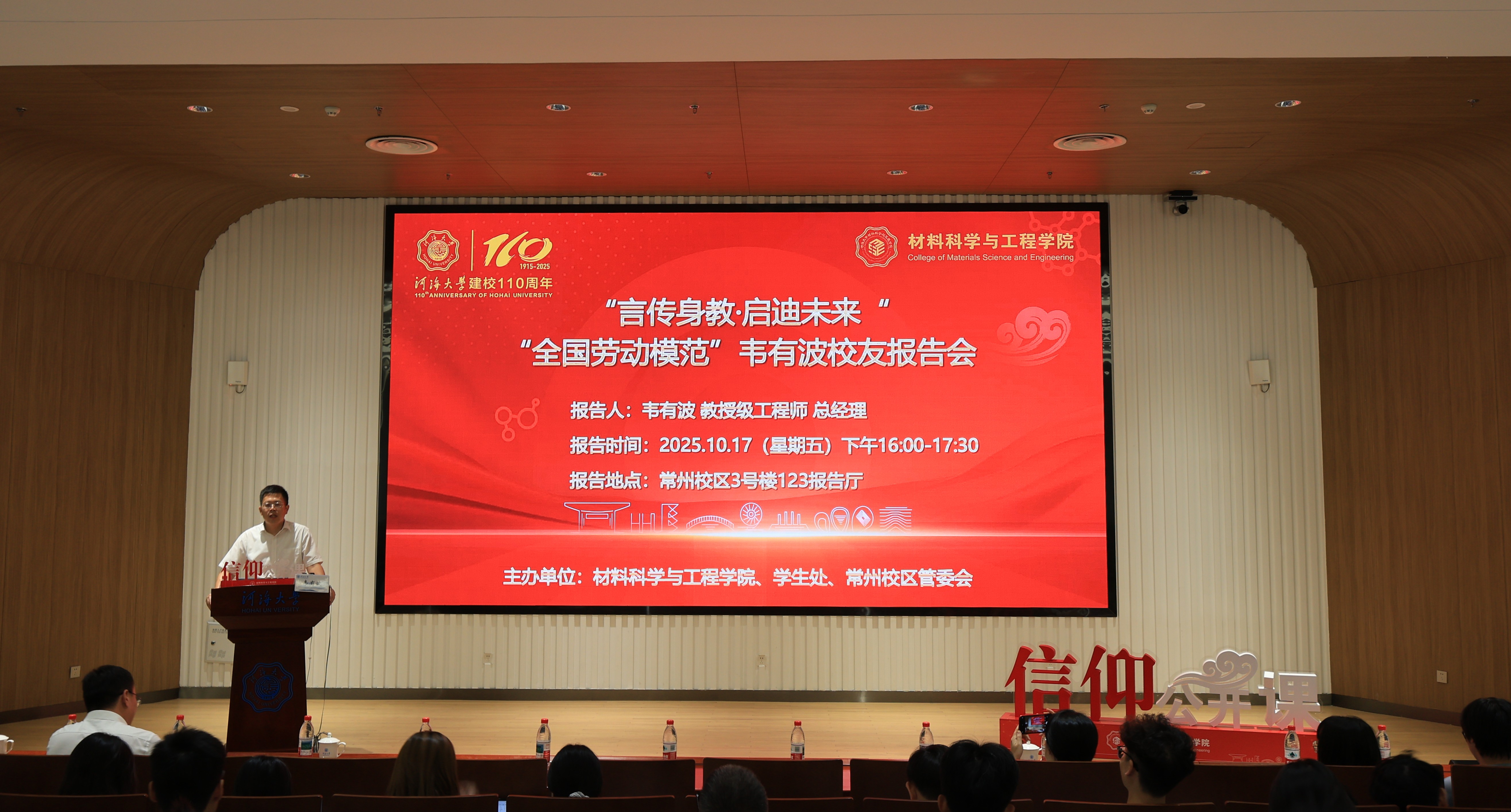 为使青年学子坚定将青春华章写在祖国大地上的选择,汲取校友榜样的奋斗力量,10月17日下午,探花视频 与常州校区管委会联合举办“言传身教·启迪未来”——“全国劳动模范”韦有波校友报告会暨信仰公开课,2025年“全国劳动模范”称号获得者、我校2005届无机非金属材料工程专业校友韦有波应邀作题为《生成未来,做最好的自己》的分享报告。