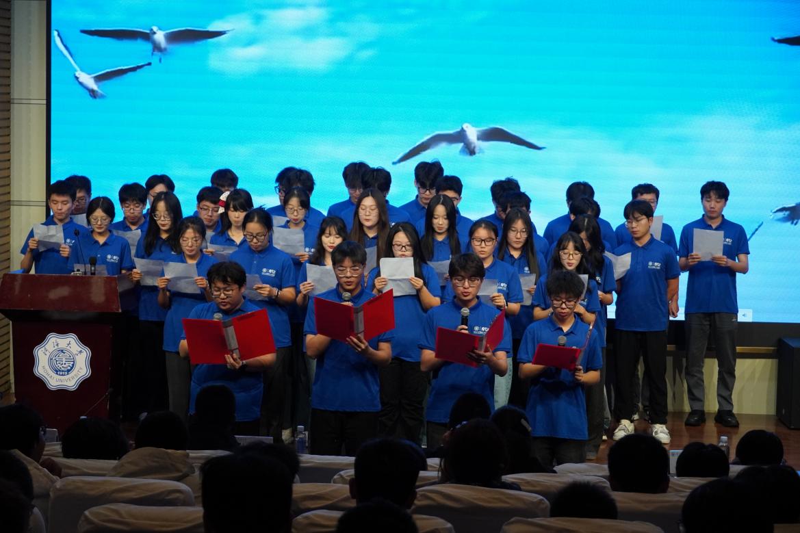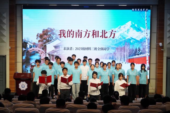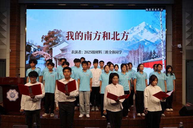 当温婉江南遇见豪迈北国,材料三班的同学们在舞台上娓娓道来一场关于山河的故事。他们用饱含深情的朗诵带领我们穿越长江黄河,走过水乡雪原。他们的声音在字里行间勾勒出祖国的山河画卷,更暗含着河海人踏平山海,从南到北,春来秋往,心向远方的情怀。